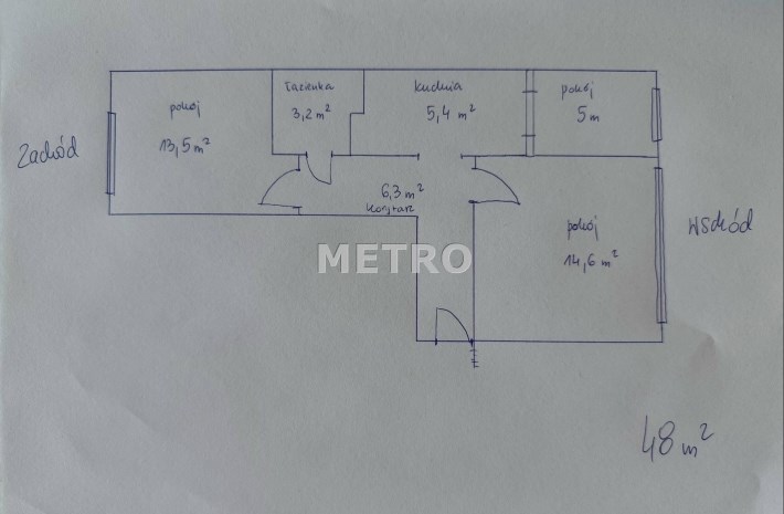 Prezentowana nieruchomość składa się z dwóch przestronnych i ustawnych pokoi (14,6m2 i 13,5 m2), wydzielonego przy kuchni (5,4 m2) dodatkowego małego pokoju (5 m2) oraz korytarza (6,3 m2) i łazienki (3,2 m2) .