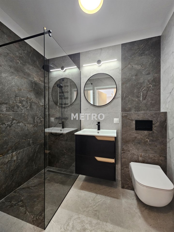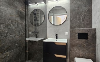 łazienka - kabina prysznicowa, wc, umywalka z szafką podwieszaną, lustro, oświetlenie