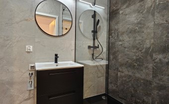 łazienka - kabina prysznicowa, wc, umywalka z szafką podwieszaną, lustro, oświetlenie