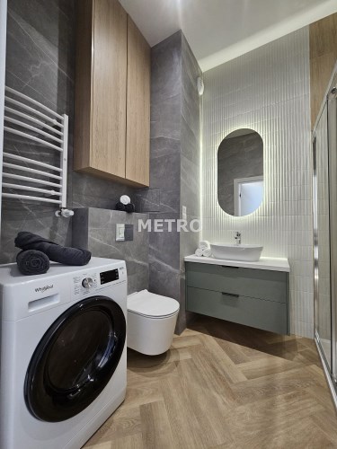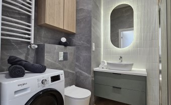 Łazienka wyposażona w dużą wnękę prysznicową, umywalkę oraz pralko-suszarkę.