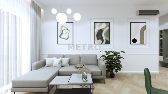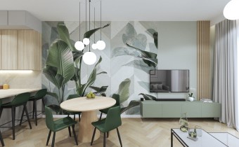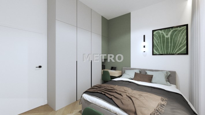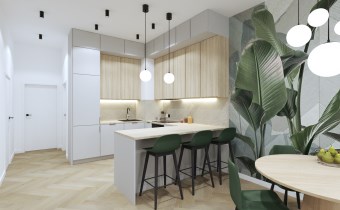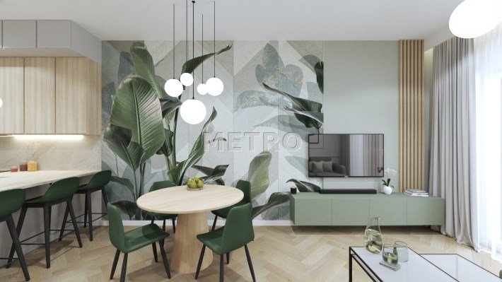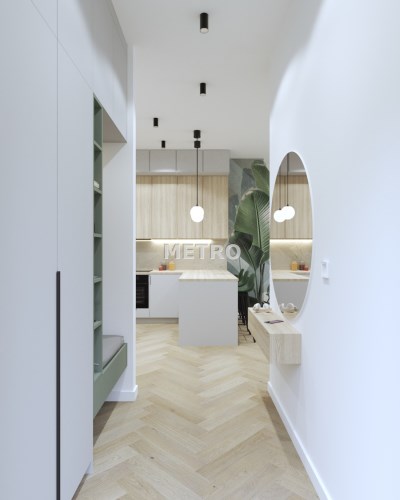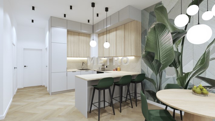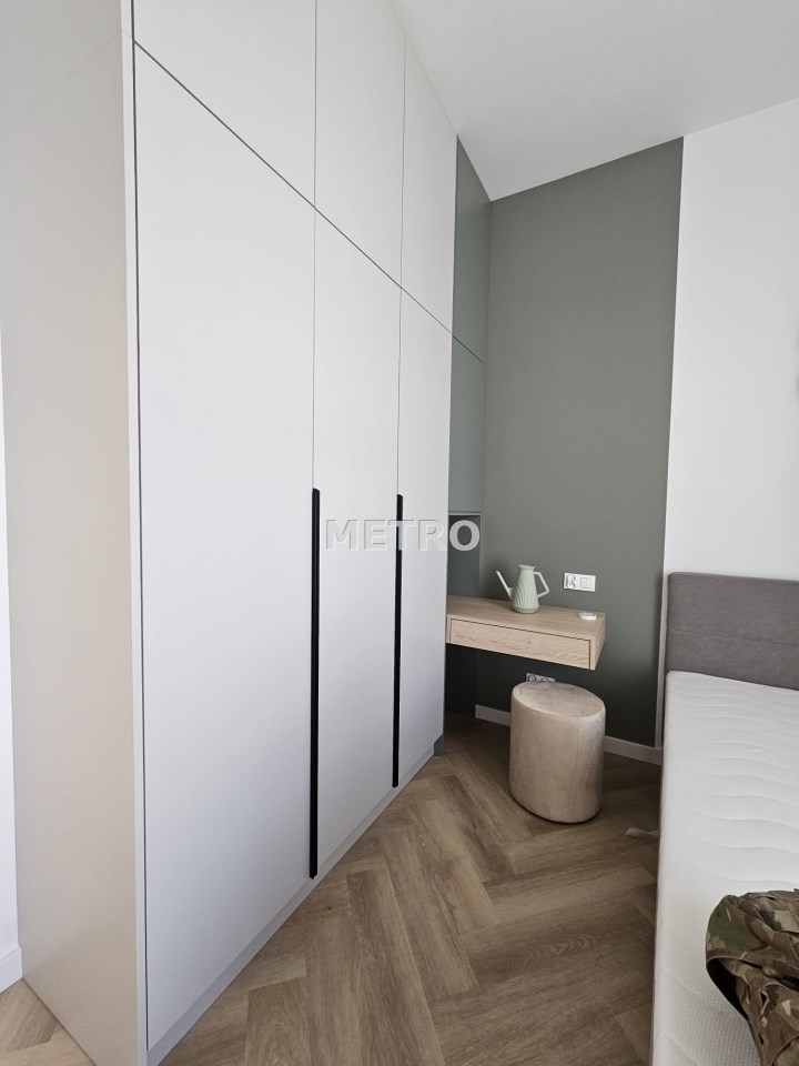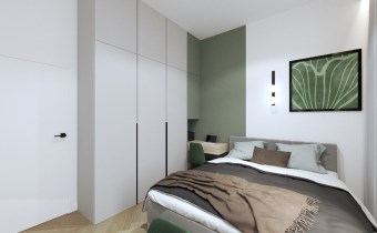 Wnętrze składa się salonu z aneksem kuchennym, dwóch sypialni oraz łazienki. Z salonu wyjście na balkon z widokiem na miasto.