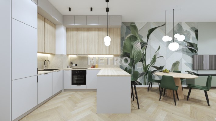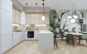 Kuchnia z nowoczesną zabudową wraz ze wszystkimi sprzętami AGD i wyposażeniem.